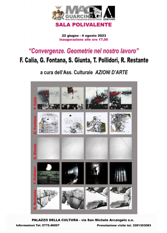 Giovedì 22 giugno 2023 alle ore 17,00 a Guarcino (FR), nella Sala Polivalente del MAC. GUARCINO Museo d’Arte Contemporanea del Piccolo Formato, apre al pubblico la mostra di: Francesco Calia, Gianni Fontana, Salvatore Giunta, Teresa Pollidori, Rosella Restante “Convergenze. Geometrie nel nostro lavoro”